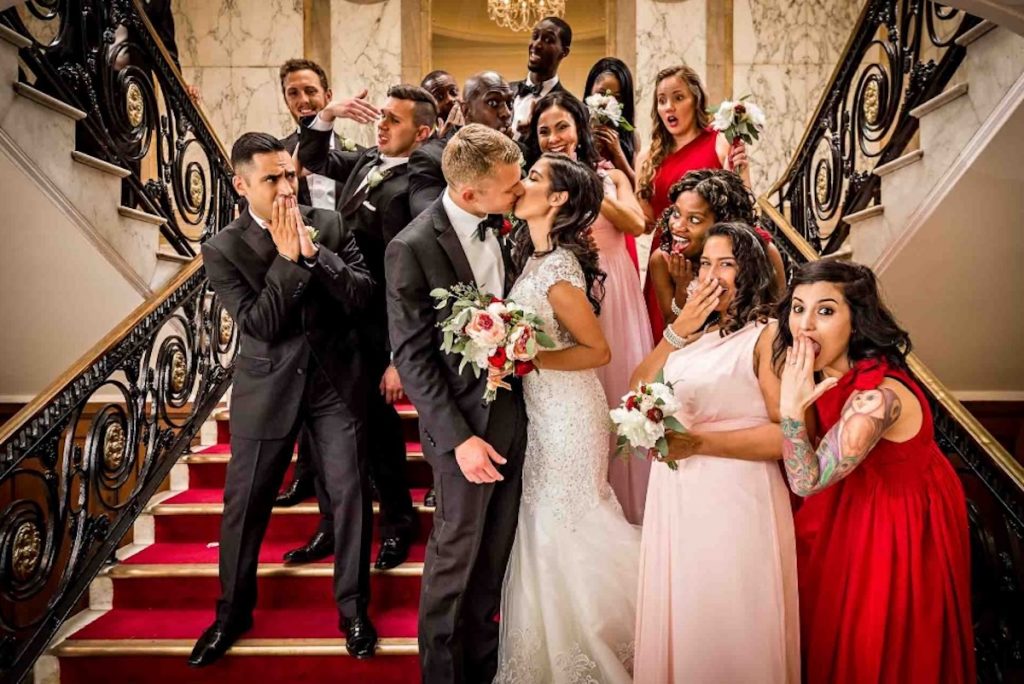 This wedding photoshoot idea captures fun and energy as the bride and groom share a kiss while the best man and bridesmaid react with a variety of expressions. Focus on the contrast between the couple’s tender moment and the playful antics of the wedding party. Keep the composition lively and dynamic to showcase personality and spontaneity, creating a joyful and memorable group image.