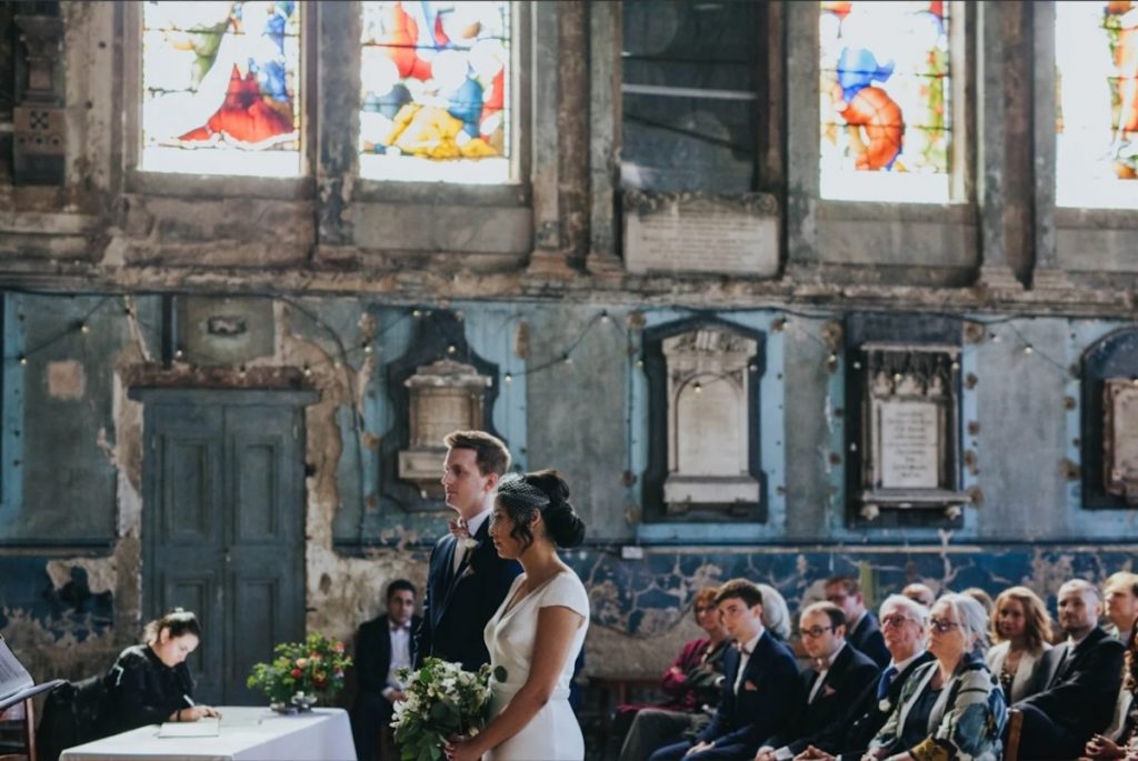 Capture the meaningful moment when the priest or pastor delivers the sermon before officiating the wedding. Use a wide composition to include both the couple and their guests, letting expressions and body language provide emotional context. Maintain balanced and respectful framing to reflect the significance and solemnity of the occasion.