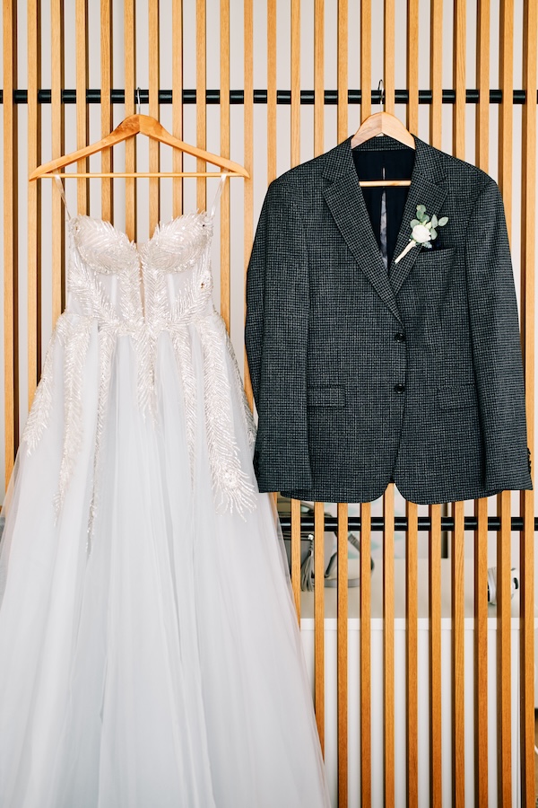 A creative wedding photography idea is to photograph the bride’s dress and groom’s tux hanging on the wall before the ceremony. Highlight textures, fabrics, and design details to showcase their elegance. Use a clean composition to emphasize the significance of these iconic pieces as part of the wedding story.